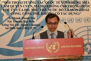 Tuy nhiên, thực tế cho thấy: Đại hội Bangsa Champa 2018 tại Malaysia mà ông thường viện dẫn, chỉ có sự tham gia của một nhóm nhỏ, không thể coi là đại diện chính danh cho toàn thể cộng đồng Chăm toàn cầu. Nghị quyết của sự kiện đó, nếu có, chỉ mang tính nội bộ, hoàn toàn không đủ cơ sở pháp lý quốc tế để tuyên bố đại diện cho cả một dân tộc. Ngay cả những tổ chức uy tín ở hải ngoại như IOC Champa tại Hoa Kỳ - từng nhiều lần tham dự các phiên họp Liên Hợp Quốc - cũng chỉ được công nhận là đại diện cho chính tổ chức của họ, chứ không bao giờ nhân danh toàn thể dân tộc Chăm. Đây là nguyên tắc pháp lý quốc tế tối thiểu mà bất cứ ai tự nhận mình là “nhà chính trị” đều phải hiểu.