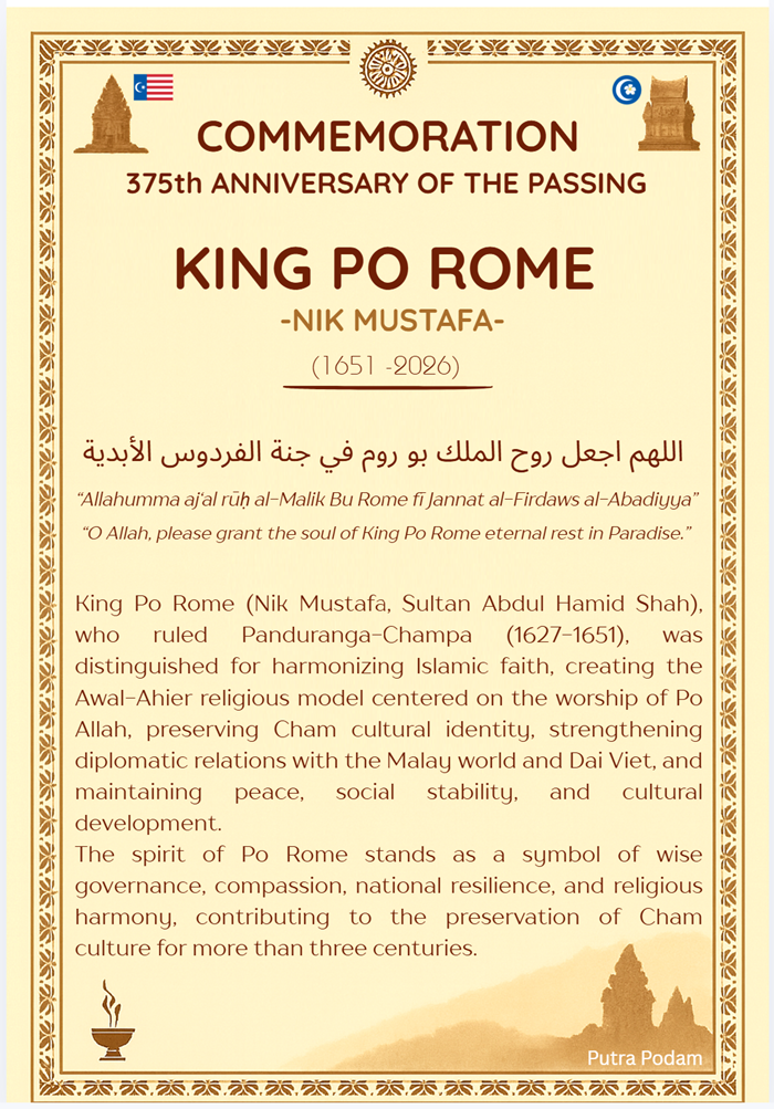 Today, in an atmosphere of solemnity and deep emotion, we gather here to commemorate the 375th anniversary of the passing of King Po Rome (Nik Mustafa), the illustrious monarch who guided Panduranga-Champa through the turbulent transformations of the seventeenth century. Three and a half centuries have passed, yet the radiance of Po Rome’s reign continues to illuminate the culture, religion, politics, and spiritual life of the peoples of the Panduranga-Champa land an enduring current that binds together the past, the present, and the future.