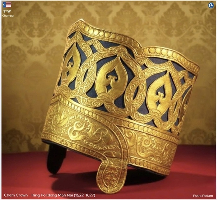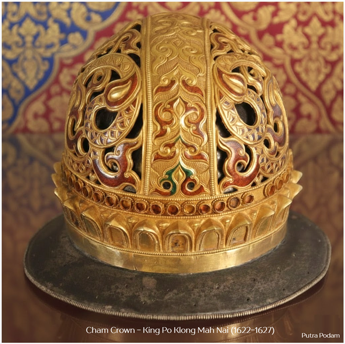 Hình 6. Mặc dù chiếc mão này hiện được giới thiệu là “vương miện của vua Po Klong Mah Nai”, song xét về hình thức, phong cách nghệ thuật, bối cảnh tôn giáo và tư liệu lịch sử, không có cơ sở khoa học để xác định đây là mão ngự dụng của vua Po Klong Mah Nai (Maha Taha), vua Panduranga thế kỷ XVII. Hiện vật nên được hiểu là mão nghi lễ hoặc hiện vật thờ tự mang tính biểu trưng được tạo tác hậu kỳ, phục vụ việc thần thánh hóa hình tượng vua tại đền, không phải hiện vật lịch sử gốc của triều đại. Phản biện này đề nghị hội đồng khoa học điều chỉnh nhãn trưng bày, phân loại hiện vật, đồng thời mở rộng nghiên cứu để làm rõ lịch sử nghi lễ và thần thánh hóa vua Champa. Ảnh: Putra Podam.