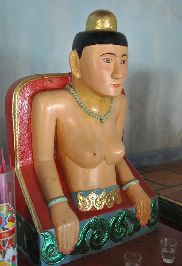 Hình 13. Hoàng hậu Bia Som (Po Bia Som), Hoàng hậu chính thức của vua Po Klong Mah Nai (Po Mah Taha), là vị hoàng hậu theo Hồi giáo (Islam). Bức tượng được chụp trước khi thay áo hoàng triều Champa. Bức tượng tượng này được đặt trong phòng phía Bắc của đền Po Klong Mah Nai. Ảnh: Putra Podam.