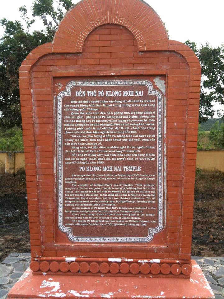 Hình 7. Tấm bia được dựng tại cổng chính của đền Po Klong Mah Nai, nơi thờ vua Po Klong Mah Nai (trị vì 1622-1627). Nội dung trên bia do Sở Văn hóa - Thể thao và Du lịch tỉnh Lâm Đồng (trước đây là tỉnh Bình Thuận) chỉ đạo thực hiện. Tuy nhiên, phần nội dung ghi lại lịch sử Champa có nhiều điểm chưa chính xác so với tư liệu lịch sử Champa. Ảnh: Putra Podam.