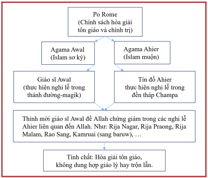 Hình 21. Giải thích sơ đồ: Po Rome đứng trung tâm như nhà hoạch định chính sách, điều phối mối quan hệ tôn giáo, không hòa trộn giáo lý, nhưng đảm bảo tính hợp pháp tôn giáo trong cộng đồng đa tôn giáo Panduranga. Agama Awal: Giáo sĩ Awal chỉ thực hiện nghi lễ Islam trong thánh đường, không tham dự các nghi lễ Ahier hoặc thờ thần Hindu Ấn giáo. Agama Ahier: Không có chức sắc chuyên trách Allah; các tín đồ Ahier mời Acar Awal chứng giám Allah trong các nghi lễ quan trọng như Rija. Mối quan hệ giữa hai hệ thống là hòa giải nghi lễ, phản ánh thực hành tôn giáo linh hoạt và chính sách quản trị đa tôn giáo của Po Rome, chứ không phải dung hợp giáo lý. Lễ Rija: Sự tham gia của Acar Awal chỉ liên quan đến Allah, không liên quan đến thần linh Champa hay Hindu Ấn giáo, phản ánh đúng chức năng nghi lễ và bản chất hòa giải tôn giáo. Ảnh: Putra Podam.