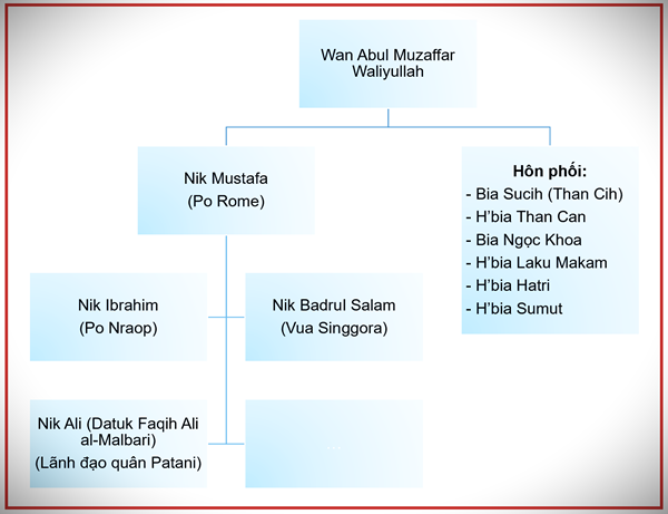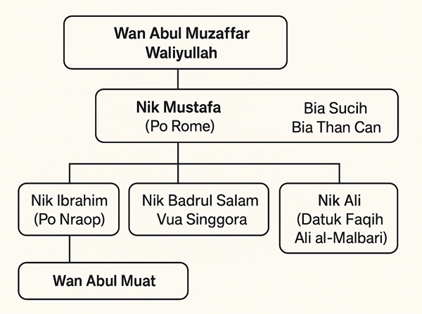 1.2.2. Gia phả tại Kelantan-Malaysia: Trong các gia phả và tư liệu lịch sử của hoàng tộc Kelantan và Patani, Po Rome được biết đến với tên Hồi giáo Nik Mustafa bin Wan Abul Muzaffar Waliyullah, sinh ra trong dòng dõi quý tộc Nik, Wan. Dòng thông tin này nhấn mạnh mối liên hệ tôn giáo, chính trị giữa Champa và các vương triều Hồi giáo Đông Nam Á, đặc biệt là Kelantan và Patani. Gia phả Malaysia không chỉ ghi nhận xuất thân và huyết thống của Po Rome, mà còn mô tả vai trò của các con trai của Po Rome trong các trung tâm Hồi giáo khu vực, phản ánh sự lan tỏa ảnh hưởng chính trị, tôn giáo của Panduranga ra ngoài biên giới vương quốc.