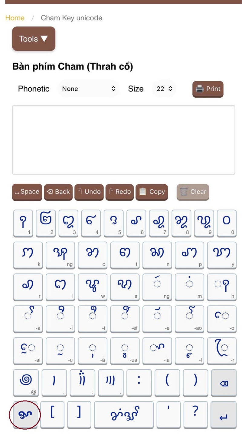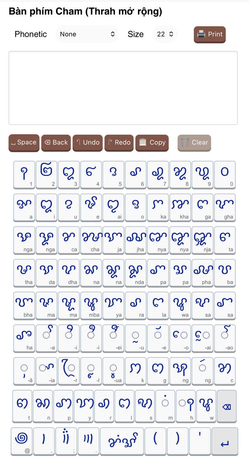 Hình 2. Giao diện Bàn phím Cham (Thrah cổ). Giao diện mặc định.