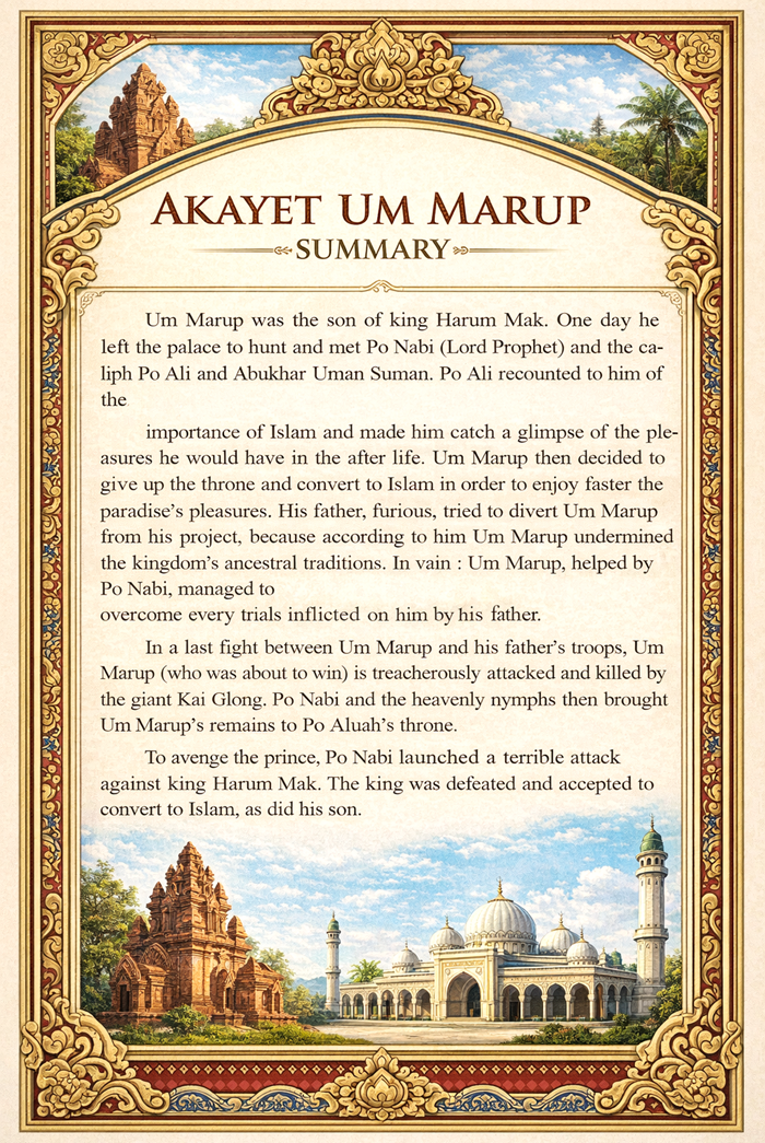 Tóm tắt: Um Marup là con trai của vua Harum Mak. Một ngày nọ, ông rời hoàng cung đi săn và gặp Po Nabi (Thiên sứ), cùng hai vị khalip là Po Ali và Abukhar Uman Suman. Po Ali kể cho ông nghe về tầm quan trọng của Islam và cho ông thấy trước những niềm vui nơi đời sau.