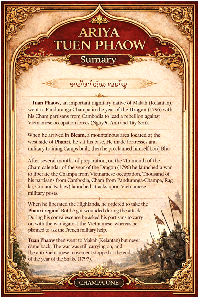 Tóm tắt: Tuan Phaow, một nhân vật quan trọng quê ở Makah (Kelantan), đã đến Panduranga-Champa vào năm Thìn (1796) cùng những người Cham ủng hộ ông từ Campuchia để lãnh đạo cuộc nổi dậy chống lại lực lượng chiếm đóng của người Việt (Nguyễn Ánh và Tây Sơn).