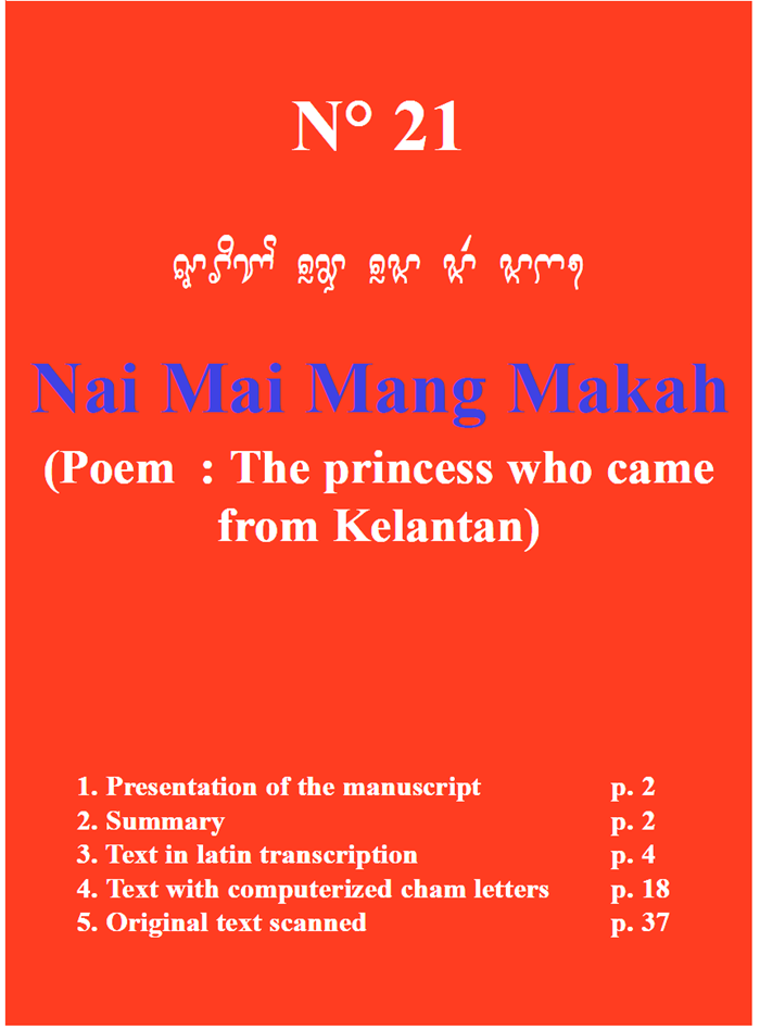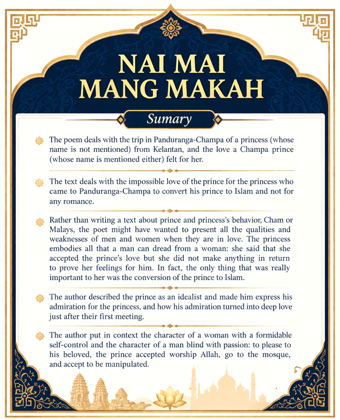 Tóm tắt: Nai Mai Mang Makah, bài thơ kể về chuyến đi đến Panduranga-Champa của một công chúa đến từ Kelantan, và một hoàng tử Champa đã đem lòng yêu nàng.