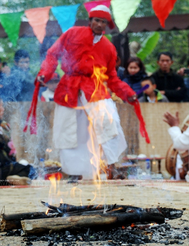 Hình 5. Ông Kaing múa đạp lửa đang bốc cháy tại Rija Nagar. Ka-ing được xem là một thành phần quan trọng trong hệ thống chủ lễ dân gian là chức sắc thuộc văn hóa tín ngưỡng Cham. Mặc dù có vai trò quan trọng trong nghi lễ, Ka-ing thuộc nhóm "thầy cúng dân gian" hoặc "chức sắc chủ lễ dân gian", khác với nhóm chức sắc cao cấp (tăng lữ) chuyên trách các nghi thức trong đền tháp. Ảnh: Quỳnh Anh.
